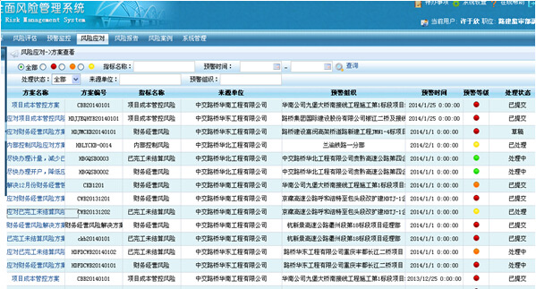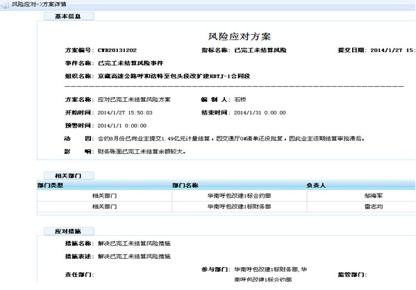 2013年,中交路橋已經(jīng)在全公司正式推行全面風(fēng)險管控信息系統(tǒng),實現(xiàn)了總部、二級公司、項目經(jīng)理部三級風(fēng)險管理機制,該系統(tǒng)為公司生產(chǎn)運營安裝了風(fēng)險雷達(dá),能夠讓公司的管理決策者做到及時掌握風(fēng)險狀況,制訂相應(yīng)的解決方案。公司監(jiān)察審計部定期組織系統(tǒng)落實情況的監(jiān)督檢查及應(yīng)用培訓(xùn),及時收集系統(tǒng)使用的反饋信息,促進(jìn)系統(tǒng)不斷完善。系統(tǒng)的使用促進(jìn)了公司對各業(yè)務(wù)板塊信息化數(shù)據(jù)的綜合分析與使用,強化了數(shù)據(jù)的準(zhǔn)確性,促進(jìn)風(fēng)險的歸口管理與及時解決,推進(jìn)了公司管理水平的提升。中交路橋在今后的經(jīng)營發(fā)展過程中,會繼續(xù)堅持依法合規(guī)經(jīng)營,樹立全面風(fēng)險意識,強化內(nèi)部管理,實現(xiàn)全面風(fēng)險管控信息系統(tǒng)的規(guī)范、高效運營,逐步建立起先進(jìn)的企業(yè)風(fēng)險管理文化,不斷增強企業(yè)規(guī)避風(fēng)險的能力,提高企業(yè)經(jīng)營管理水平。