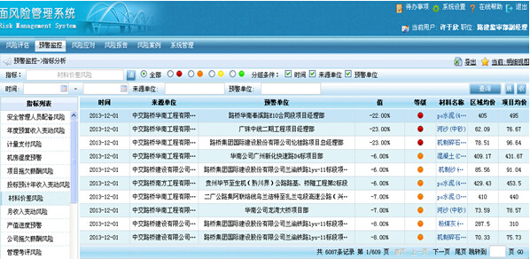 通過近三年的建設(shè)與推進(jìn)實施,公司完成了風(fēng)險信息化管理系統(tǒng)的建設(shè),該系統(tǒng)通過對公司13個部門28個風(fēng)險管控指標(biāo)進(jìn)行監(jiān)控,一般為每月初自動提取數(shù)據(jù)并運算結(jié)果,運算結(jié)果自動匹配預(yù)警區(qū)間,自動分級預(yù)警。即對可量化的風(fēng)險指標(biāo)設(shè)定不同預(yù)警閾值,對出現(xiàn)超過預(yù)警閾值或達(dá)到預(yù)警條件的風(fēng)險問題,根據(jù)問題的出現(xiàn)頻率或性質(zhì),按照不同級別向有關(guān)業(yè)務(wù)部門進(jìn)行自動信息化預(yù)警提示,從而能夠提前采取措施,保證公司戰(zhàn)略目標(biāo)的順利完成。同時,系統(tǒng)界面美觀,操作方便靈活,具備了較強的風(fēng)險信息搜索功能與統(tǒng)計功能,可分別根據(jù)預(yù)警時期、風(fēng)險級別、風(fēng)險指標(biāo)、公司名稱、項目名稱等多條件進(jìn)行搜索查看;系統(tǒng)可維護(hù)性強,實時性高,而且風(fēng)險應(yīng)對方案審批流程與公司OA辦公系統(tǒng)及飛信系統(tǒng)掛鉤,這樣能夠準(zhǔn)確、及時、全面的管理風(fēng)險數(shù)據(jù),實現(xiàn)了風(fēng)險應(yīng)對與辦公系統(tǒng)的一體化,搭建了公司各部門之間風(fēng)險溝通的橋梁,為公司應(yīng)對危機,規(guī)避風(fēng)險發(fā)揮了重要作用,主要成果及系統(tǒng)框架展示如下: